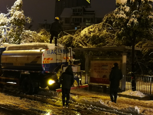 分公司在做好自身除雪救災工作的同時,積極調配資源,參加到合肥市區公交站臺積雪清掃工作。從4日上午10:00開始,分公司集結300多人,調配裝載機、灑水車等各類機械設備20多臺,與積雪比速度,清掃持續到5日凌晨4:00左右,共清掃了40多座公交站臺。