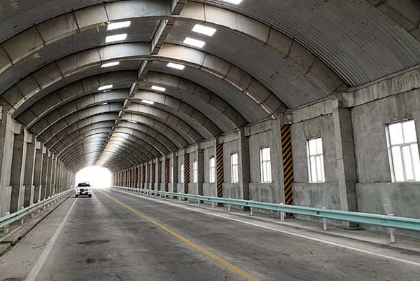 S201線路途徑瑪依塔斯風區,公司所承建的防風雪試驗工程在風雪災害最為嚴重的路段。該項目采用在路面上方建設一座仿造隧道式的棚洞,并用防雪網與擋雪板對棚洞的進出口及風吹雪嚴重路段進行防護,以防止吹雪在路面和棚洞洞口處堆積造成通行困難。棚洞主體采用鋼筋混凝土框架結構,能抵抗12級大風。為了行車安全,還在棚洞內部設置了波形梁護欄。該項目也是目前國內首例采用棚洞工程進行吹雪防治的嘗試,開辟了新疆地區科技創新成果與實際工程結合應用的新篇章。