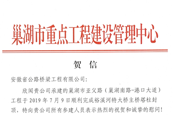 近日,巢湖市重點工程建設管理中心向公司發來賀信,對公司承建的巢湖市亞父路(巢湖南路-港口大道)工程在7月9日順利完成裕溪河特大橋主橋塔柱封頂表示熱烈祝賀和誠摯慰問。