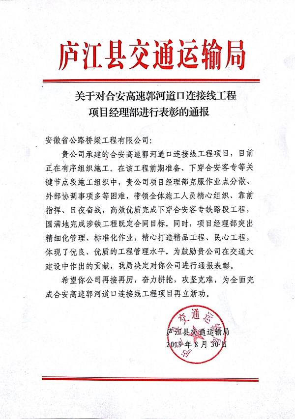 近期,廬江縣交通運輸局對郭柯路項目圓滿完成涉鐵工程既定合同目標進行了通報表彰。