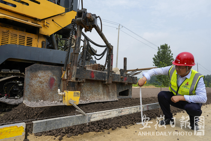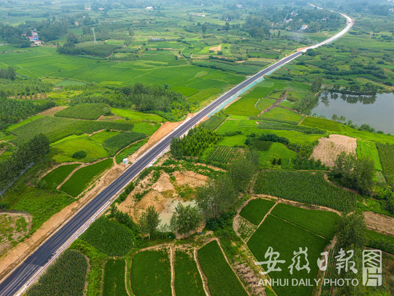 7月25日,拍攝的由安徽路橋承建的霍邱縣產業振興公路。該項目全長 19.245公里,目前路基工程已完成,正在全力推進路面施工階段,計劃2023年10月完成項目整體建設任務。建成后將解決沿線5個鄉鎮30萬群眾出行問題,帶動沿淮、沿淠鄉鎮產業發展,鞏固脫貧成效,助力鄉村振興。
