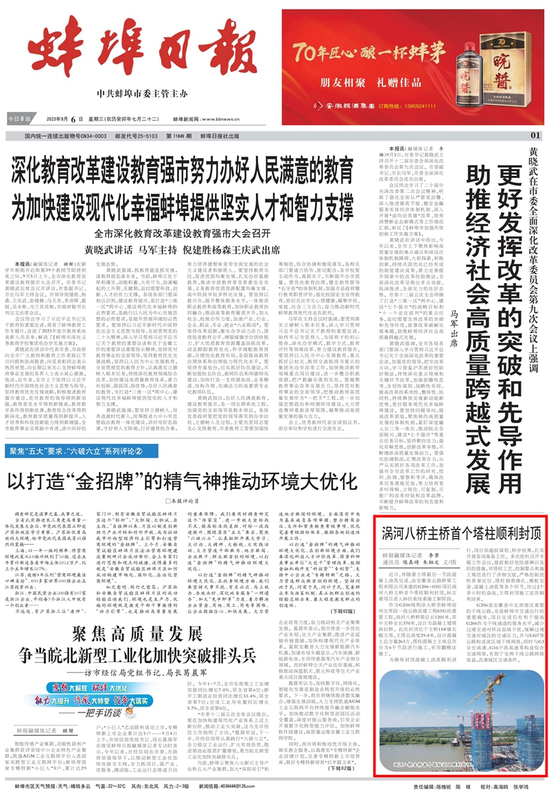 【名媒聚焦】蚌埠日報:渦河八橋主橋首個塔柱順利封頂
