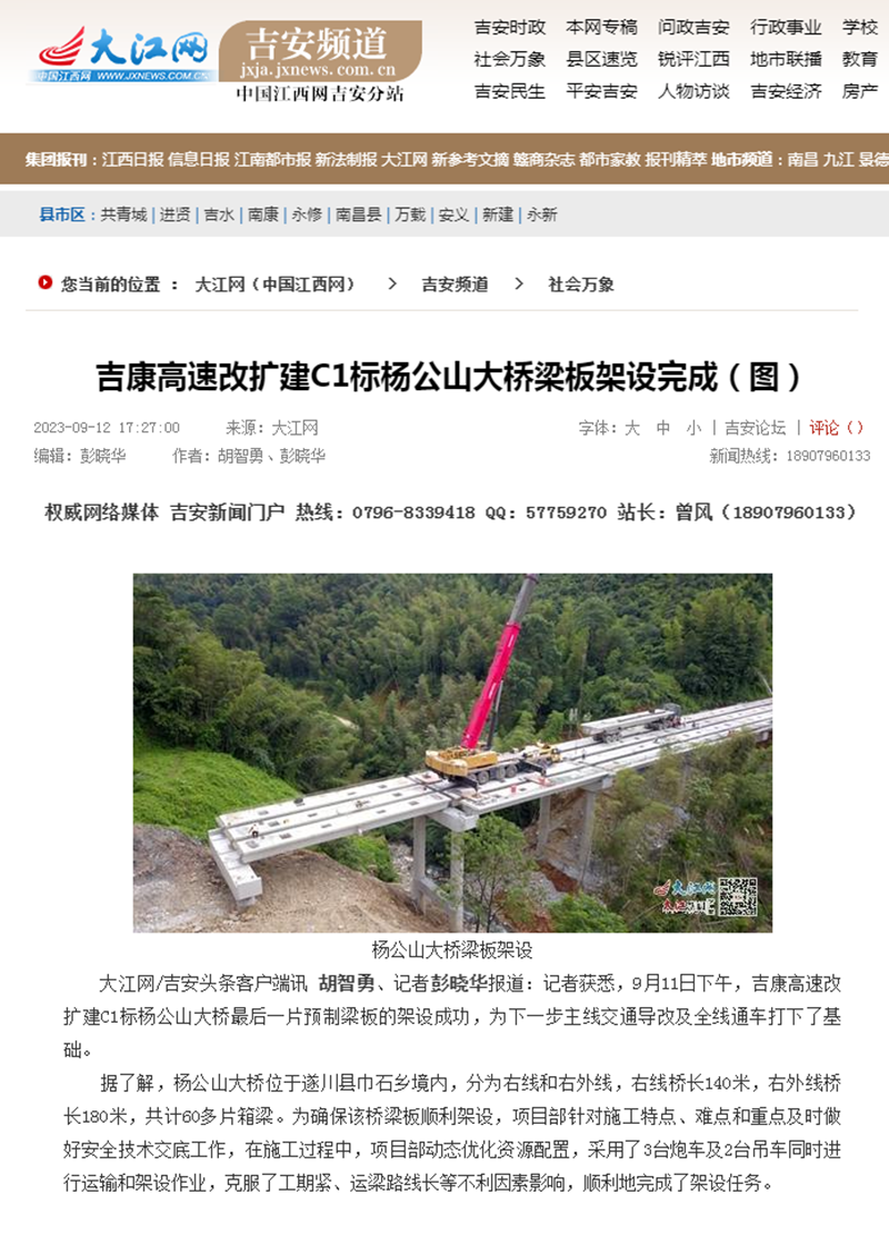 【名媒聚焦】大江網(wǎng):安徽路橋吉康改擴(kuò)建C1標(biāo)楊公山大橋梁板架設(shè)完成