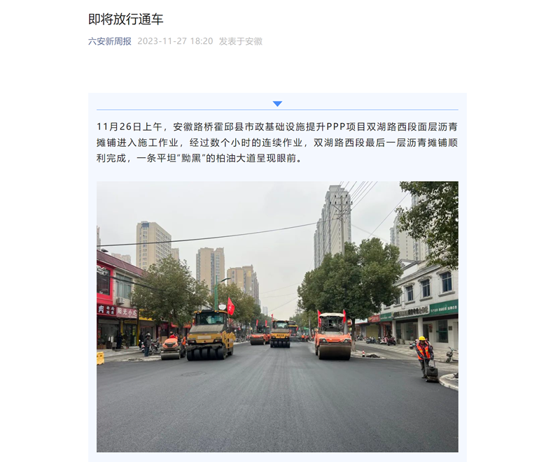 11月26日上午,安徽路橋霍邱縣市政基礎(chǔ)設(shè)施提升PPP項目雙湖路西段面層瀝青攤鋪進入施工作業(yè),經(jīng)過數(shù)個小時的連續(xù)作業(yè),雙湖路西段最后一層瀝青攤鋪順利完成,一條平坦“黝黑”的柏油大道呈現(xiàn)眼前。