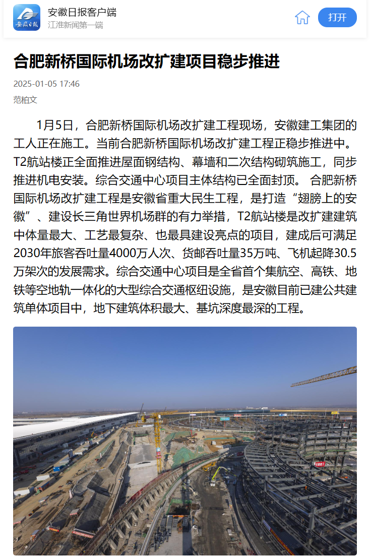 【名媒聚焦】安徽日報、合肥新聞聯播等省市主流媒體關注報道合肥新橋國際機場綜合交通中心項目