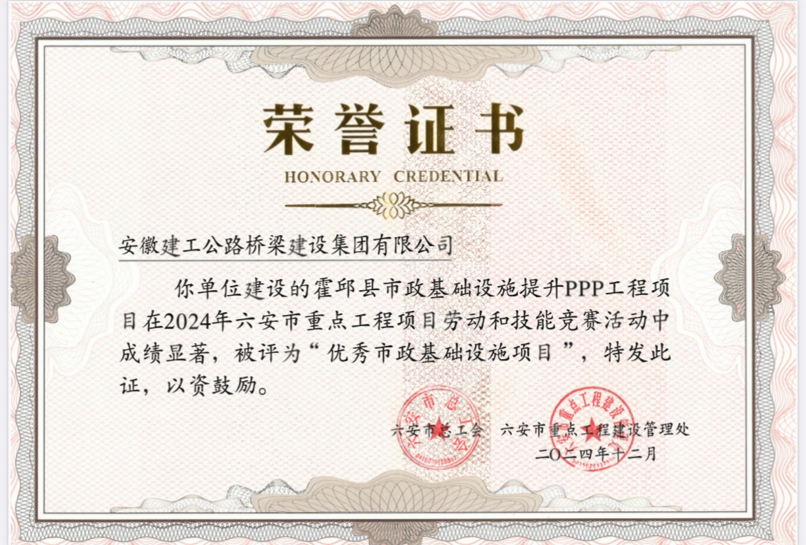 近日,“建功新時代 奮進新征程”2024年六安市重點工程項目勞動和技能競賽成果公布,霍邱PPP項目榮獲“優秀市政基礎設施項目”榮譽稱號。