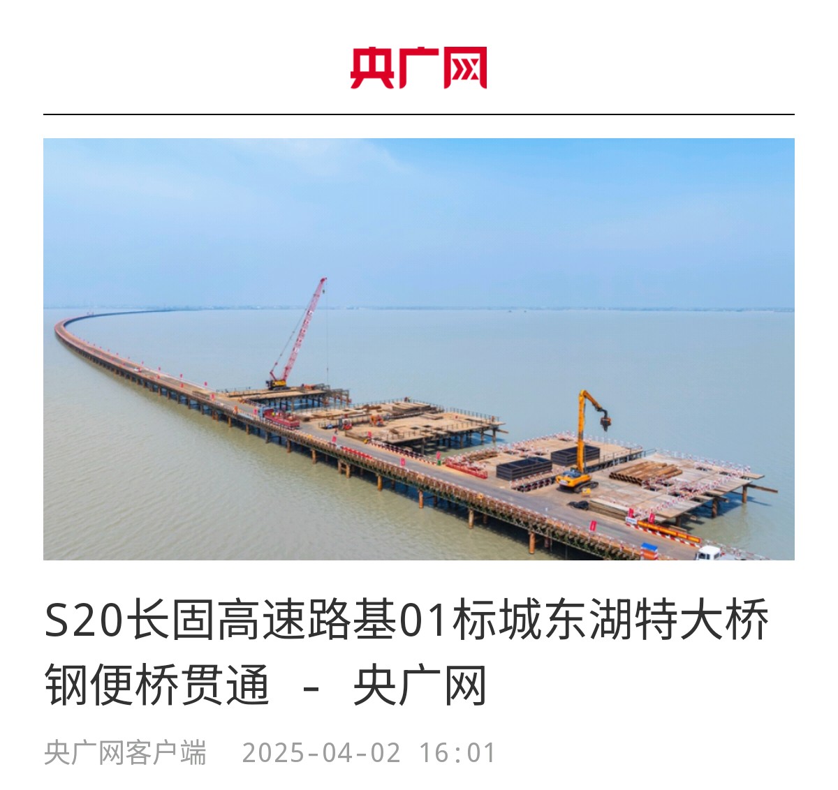 【央媒聚焦】央廣網等主流媒體關注報道S20長固高速路基01標城東湖特大橋鋼便橋貫通