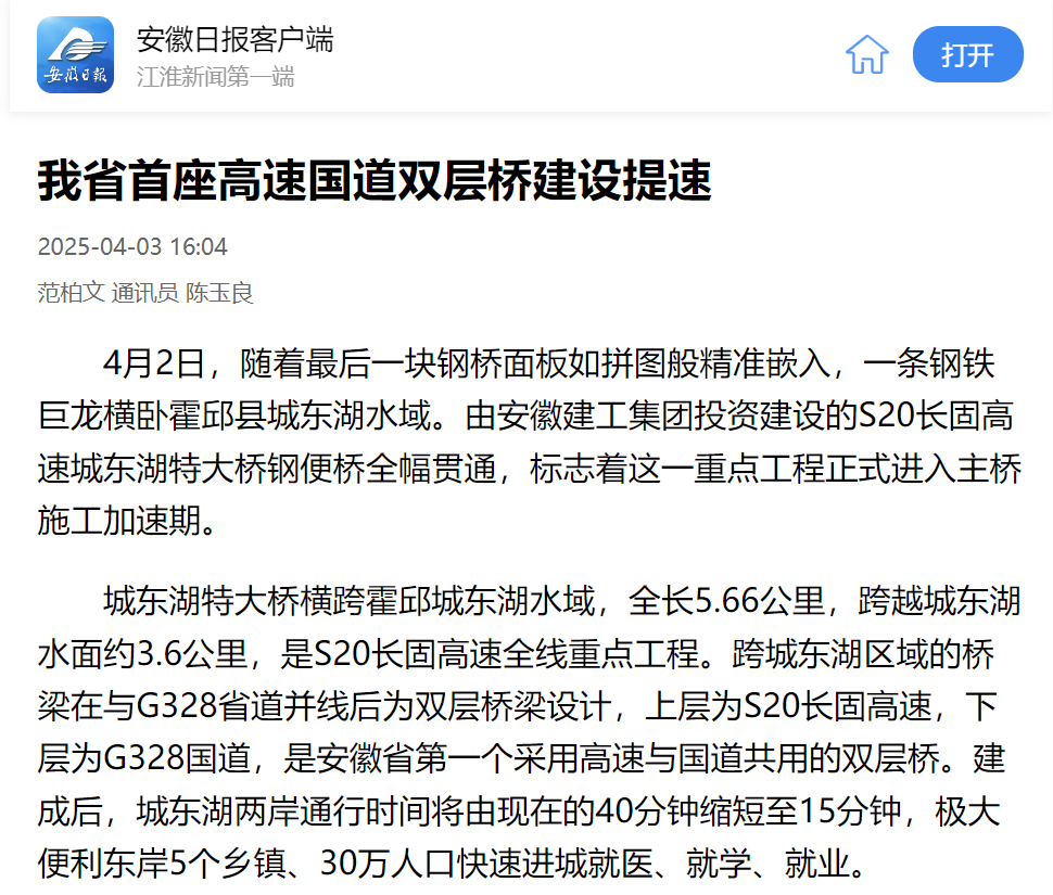 4月2日,隨著最后一塊鋼橋面板精準嵌入,由安徽建工集團投資建設的S20長固高速路基01標段迎來重大節點——城東湖特大橋鋼便橋實現全幅貫通,為主橋施工打通了"任督二脈"。