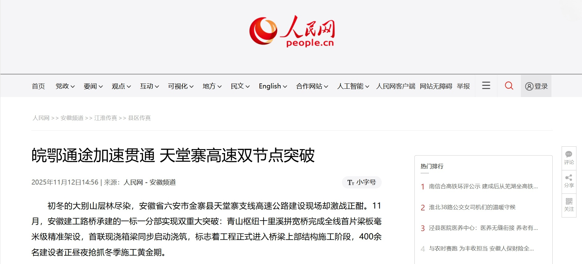 【名媒聚焦】人民網(wǎng)安徽頻道:皖鄂通途加速貫通 天堂寨高速雙節(jié)點突破
