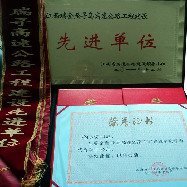 公司承建的瑞尋A7標在公司的正確領導下,在以劉大雷同志為首的項目全體員工的共同奮斗下,經過兩年的頑強拼搏、艱苦施工,終于實現了瑞尋高速公路的建成通車,在贛南大地描繪了一條絢麗的彩虹,書寫了一幅質優、安全、廉潔、環保的壯麗畫卷。瑞尋A7標以工程質量更優、外觀形象更美、生態環境更佳、依法管理更嚴、安全廉潔更好為要求,以抓細節、樹精品、講程序、促規范、善創新、爭一流為管理理念,取得了一系列的優異成績。在項目辦的兩次階段評比中均獲得A段第一,全線第二名的好成績,還獲得了業主頒布的“先進單位”稱號,項目經理劉大雷獲得了瑞尋項目“優秀項目經理”稱號,項目總工戴聲慶、副經理鳳爾飛、王星輝和黃明明四人獲得了“先進個人”稱號。