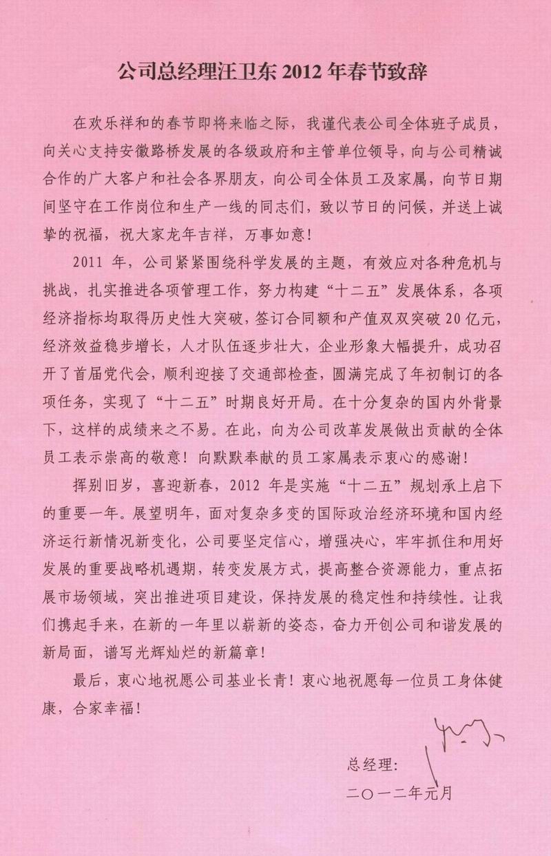 公司總經理汪衛東2012年春節致辭