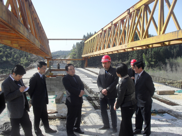 在金字牌大橋現場,項目經理黃華就項目工程總體完成情況、剩余工程量、下步計劃安排以及金字牌跨皖贛鐵路橋的施工進展情況作了詳細匯報。王福宏書記深入到箱梁安裝施工現場,對施工進展情況進行了詳細的察看,對該標段的建設情況表示了肯定;并要求該標段在抓進度的同時要保證質量、安全,確保圓滿完成剩余工程量。王福宏書記還代表黃山市委、市政府對該標段建設者表示親切慰問。