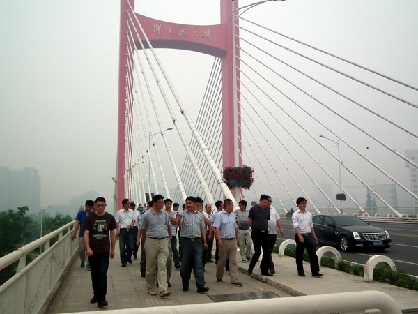 觀摩團一行首先來到淠史杭大橋前駐足參觀。在隨后召開座談會上,石懷遠代表公司就該工程的實施、技術要點、質量安全管理、工程進度等情況向與會人員作了簡要匯報。公司副總工程師陳莘對該橋的工藝和施工要點作了講解。重點局項目管理二處鄭浩處長指出,安徽路橋在斜拉橋施工上有著有目共睹的成績,希望能結合以前的施工案例,總結經驗,以爭取更大的發展空間。