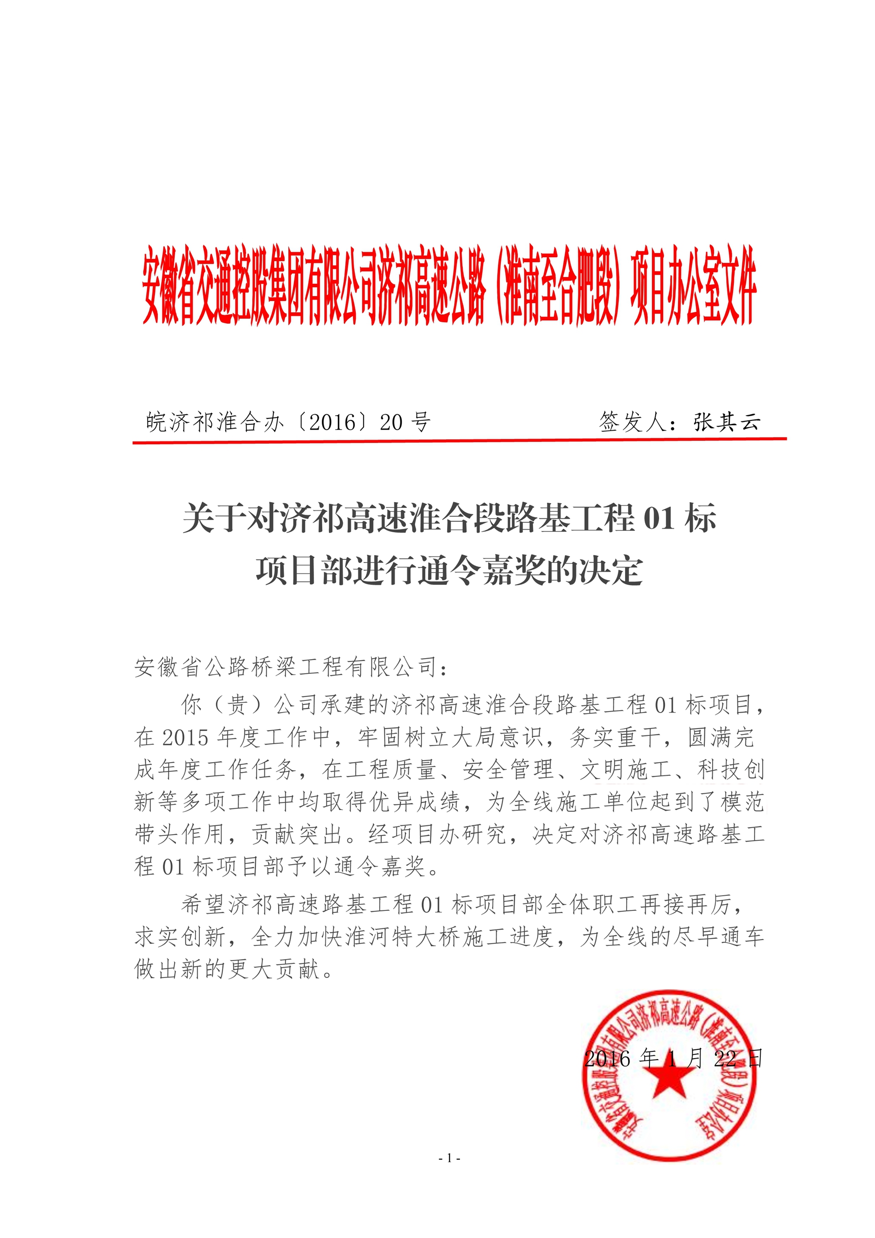 1月22日,安徽省交通控股集團(tuán)發(fā)來(lái)嘉獎(jiǎng)令,對(duì)公司承建的濟(jì)祁高速淮合段路基工程01 標(biāo)項(xiàng)目通令嘉獎(jiǎng)。