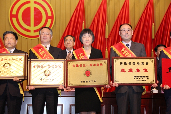 4月29日,安徽省慶“五一”暨投身“調轉促”、建功“十三五”勞動競賽動員大會在安徽大劇院隆重召開,省委書記王學軍、省長李錦斌等五大班子領導出席大會。公司作為省“五一勞動獎狀”獲得企業在大會上受到了通報表彰,公司黨委書記陳光磊代表公司上臺領獎,省委常委、秘書長唐承沛為公司頒發了獎牌。