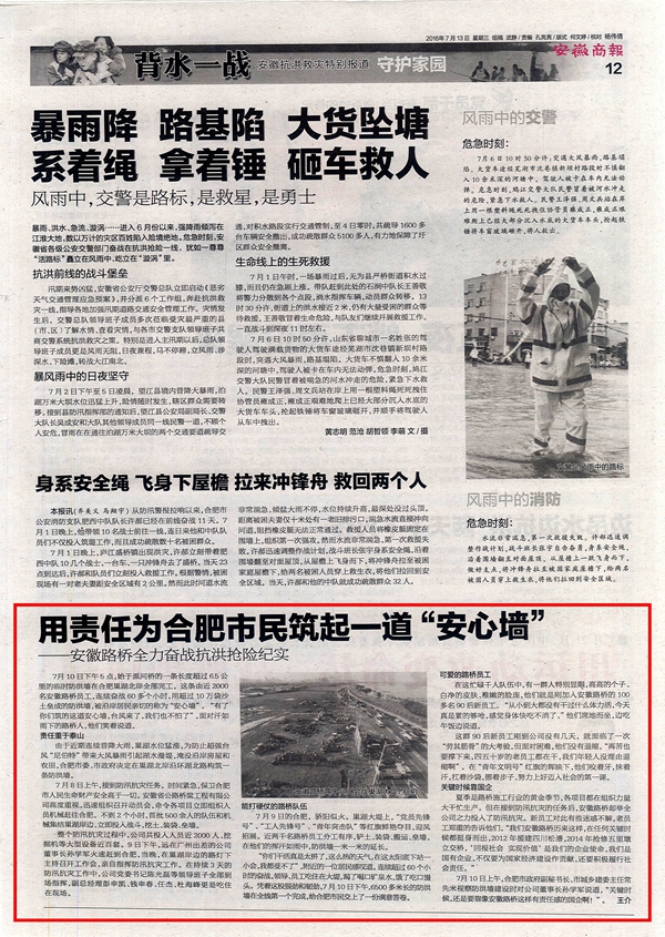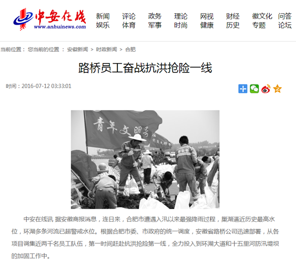 省級媒體聚焦公司抗洪搶險工作 發布時間:2016年07月13日 來源:黨委辦公室 發布人: 作者:王東 瀏覽:4684次 近日,公司積極響應合肥市委、市政府號召,全力參與環湖大道和十五里河抗洪搶險的事跡得到社會的高度關注。7月12日、13日,中安在線、《安徽商報》等多家省級媒體對公司抗洪搶險事跡進行了連續報道。