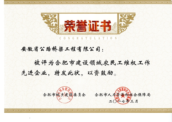 公司榮獲“合肥市建設領域農民工維權工作先進企業” 稱號 發布時間:2017年04月27日 來源:市政分公司 發布人: 作者:董丁祥 瀏覽:2934次 近日,合肥市城鄉建設委員會、人力資源和社會保障局表彰了在建設領域農民工維權工作中表現突出的單位,公司榮獲“合肥市建設領域農民工維權工作先進企業” 稱號。