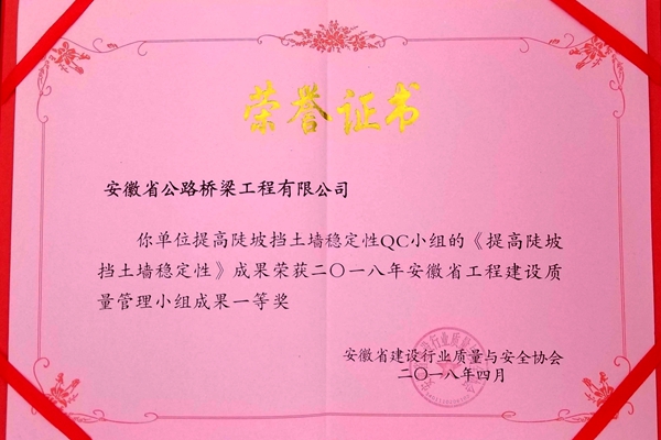 其中,合寧05標(biāo)申報(bào)的《確保鉆孔樁灌注I類樁100%合格率》和《提高橋梁防撞護(hù)欄鋼筋保護(hù)層合格率90%以上》分別榮獲一、二等獎(jiǎng);由績溪S456項(xiàng)目申報(bào)的《提高陡坡?lián)跬翂Ψ€(wěn)定性》榮獲獲一等獎(jiǎng)。