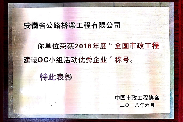 6月23日,2018年度全國市政工程建設優秀QC小組成果發布及表彰會在昆明召開,由市政分公司組織選送的六項成果全部獲獎,公司榮獲2018年度“全國市政工程建設QC小組活動優秀企業”榮譽稱號。