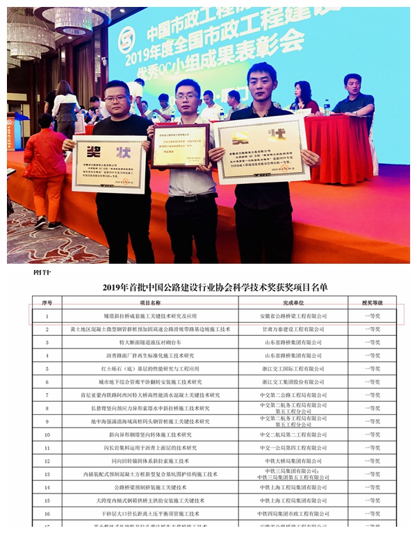 中國公路建設行業協會科學技術獎是為貫徹國家深入實施創新驅動發展戰略方針,促進公路交通創新發展,進一步推動成果轉化和行業產學研用深度融合設立的國家級行業協會獎,公司也是省內唯一一家榮獲一等獎的省屬企業。中國市政協會本次共發布QC成果800余項,公司有8項成果參加發布。近4年來,公司已累計榮獲一等獎3項、二等獎5項、三等獎6項,在省內行業處于領先水平。