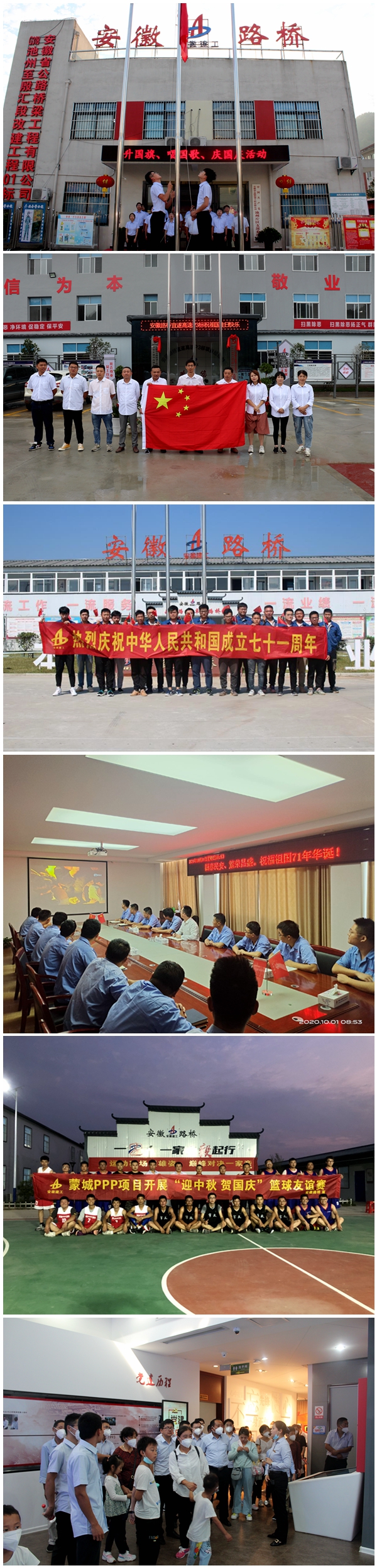 國慶前夕,市政分公司開展“學習強國·一站到底”迎中秋慶國慶知識競賽,以賽學史,吸引了來自十多個項目青年員工的積極參與。國慶當日,福建漳州項目、陜西合陽項目、江西宜遂高速P3標、河南黃河特大橋項目、固蚌02標、徽州大道等省內外重點項目共同舉行“升國旗、唱國歌、慶國慶”主題活動,表達對祖國母親的祝福之情。明巢高速05標、合肥軌道4號線01標等項目黨支部組織全體員工集中觀看《我和我的祖國》《建國大業》《八佰》等愛國題材電影。鳳陽ppp項目、廬江片區項目組織員工就近參觀愛國主題教育基地,接受一次深刻的理想信念和愛國主義教育。此外,池州G318改建工程、蒙城PPP、蕪黃高速等項目還結合“家文化”建設,邀請職工家屬到項目部共慶佳節。