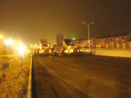 3月22日晚,市政北二環在昏黃的路燈下,開始攤鋪下穿橋的面層瀝青,以確保北二環早日暢通,確保工程早日完工。