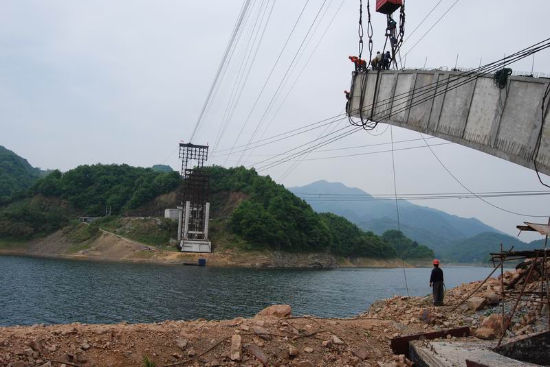 2009年4月30日上午10:30,寧靜的大別山革命老區金寨縣梅山水庫上空傳來了清脆的鞭炮聲,絢爛的禮花把青山綠水映襯得更加多姿。備受社會關注的金寨縣金桃大橋主橋第二孔,即桃嶺跨第一片重達75T的箱拱梁被緩緩吊起,在眾目凝視下穩穩就位,為“五.一”國際勞動節獻上了一份厚禮。這預示著金桃大橋又取得了一個實質性的進展和階段性的勝利。金寨縣交通局張傳旭局長、王學軍副局長、總監賈淳忠等在公司總經濟師楊文柱的陪同下,現場觀看了整個吊裝過程。下午,金寨縣人大副主任石本德、縣委常委、常務副縣長趙權分別到場表示祝賀和慰問。