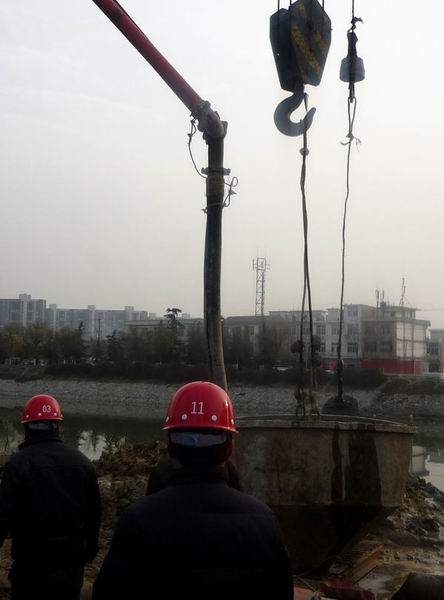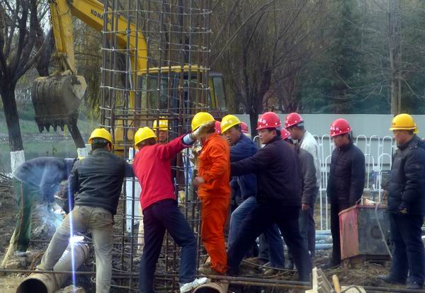 下午2時左右,鋼筋籠開始安裝。項目經理李建成和工人一道細心的將鋼筋籠送至樁孔中。導管安裝完畢后,混凝土澆灌開始。到下午4時20分左右,宋斗灣路工程第一根樁澆注完畢,樁基成型。