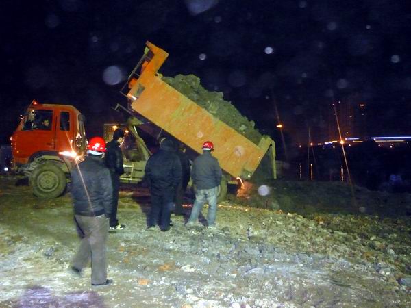 當12月19日,宋斗灣路完成第一根樁(位于南淝河北側,屬于3#橋臺)的開挖澆注工作后,項目經理部就開始籌劃南淝河南側的筑島圍堰工作。12月24日,當3#橋臺的六根樁全部澆注完成后,當天晚上仍繼續前一晚的筑島工作。每次筑島時,現場橋梁技術員、測量技術員和安全員都和工人們一起奮戰,而每次奮戰都是一個通宵。截至25日,南淝河筑島圍堰共計用土近270車,約4600方,筑島面積和筑島深度達到預案和監理要求,符合現場施工的實際要求。至此,筑島圍堰工作圓滿完成。