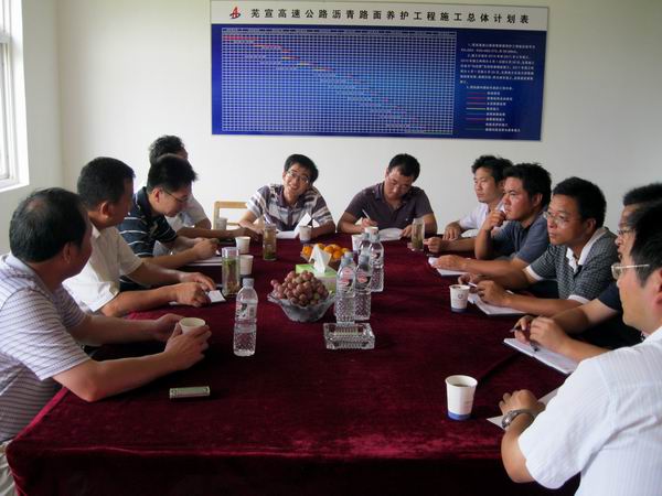 結(jié)束了對前后場的現(xiàn)場視察后,曹部長一行在項(xiàng)目部會議室召開了工作座談會議。會上交投集團(tuán)養(yǎng)護(hù)部曹部長、界阜蚌改建辦張主任、蕪宣管理處養(yǎng)護(hù)部張部長、駐地辦劉組長作為代表分別就目前施工中質(zhì)量控制的要點(diǎn)以及施工工序中需注意的幾個方面做了發(fā)言,并就此進(jìn)行了深入的交流與探討。