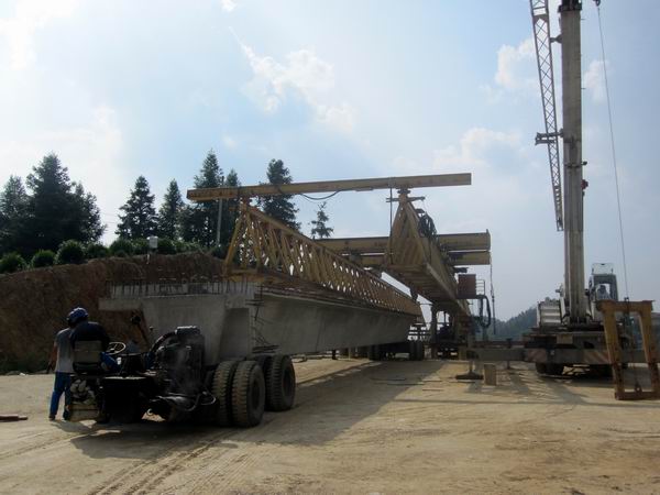 為確保架梁施工安全,我部精心制訂施工方案。同時(shí),在架梁機(jī)械驗(yàn)收合格后多次對其進(jìn)行檢查,對作業(yè)人員進(jìn)行班前教育,做好交底,制定應(yīng)急預(yù)案,保證了整個(gè)架梁過程安全、高效。隨著架橋機(jī)有節(jié)奏的完成一項(xiàng)項(xiàng)動(dòng)作,襯墊、落勾、試吊、起吊、推進(jìn),在一串協(xié)調(diào)而又連貫的運(yùn)作之后,金字牌大橋第一片梁板穩(wěn)穩(wěn)降落在它發(fā)揮作用的位置上。第一片梁的成功架設(shè),拉開了我標(biāo)段橋梁上部結(jié)構(gòu)施工的序幕,為加快實(shí)現(xiàn)年度建設(shè)目標(biāo)邁出了堅(jiān)實(shí)的一步。