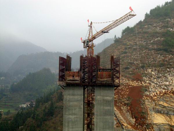 巖子腳特大橋是目前我公司施工歷史上最大跨徑的橋梁。本次澆注的是高達74米的4號主墩的左幅0#塊,設(shè)計長度13米,梁高10.5米,梁寬10米。在如此高墩上進行施工也是公司從沒有過的,0#塊施工更是橋梁施工關(guān)鍵技術(shù)所在,其難度和安全風(fēng)險可想而知。