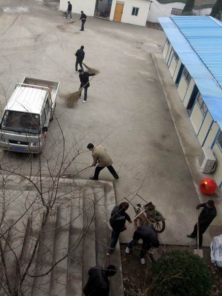 同志們各持工具,有說有笑,一時間項目部呈現(xiàn)出一派熱火朝天的景象。經(jīng)過將近3個小時的清理,項目部樓道、廁所、花壇、廣場都煥然一新。