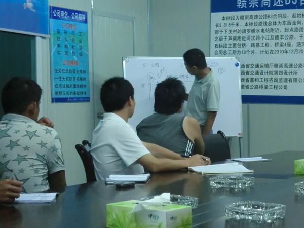 項目總工代聲慶詳細講述了橋梁施工過程中的各個環(huán)節(jié)及注意事項,根據(jù)實際施工情況,通過板書、畫圖等方法,如同把施工現(xiàn)場搬到了講臺,給新員工進行了細致全面的講述。項目經(jīng)理張春濤,根據(jù)自己多年的施工經(jīng)驗,提出了許多寶貴意見,并分發(fā)了《工地建設(shè)標準》及《規(guī)范化施工標準》兩本施工用書,希望新員工能把學到的知識運用到實際工作中去。