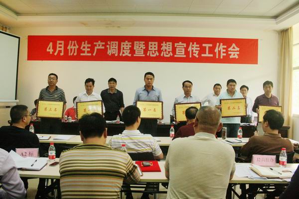 江西大廣B1標喜獲雙獎 發布時間:2012年04月12日 來源:江西大廣B1標 發布人: 作者:熊祖發 瀏覽:3196次 2012年4月11日下午,大廣項目辦召開了4月份生產調度暨思想宣傳工作會議,會議通報了2、3月度綜合評比情況,并對2011年度參建單位宣傳工作進行總結。會上,我部喜獲全線綜合評比路基項目第一名好成績,同時還榮獲2011年度項目思想宣傳先進單位稱號。業主單位贛州高速公司總經理溫楊漢親自給項目經理羅權頒獎并予以表揚。 好成績的取得是項目全員共同努力的結果,更是公司強有力支持和幫扶的結果。我部全體員工將以此次評比為契機,扎實做好后續各項工作,再接再厲,努力打造江西第一條山區六車道高速公路精品工程,維護好安徽路橋在江西市場的品牌形象。