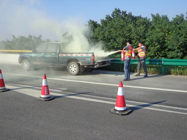 16:40,隨著蕪宣高速公路管理公司副總經理郭建華的一聲令下,蕪宣養護項目組織開展的突發交通事故處置聯合演練開始。16時45分,事故車輛撞向錐標,沖入封閉區并撞壞護欄。16:46,巡標員發現事故,立刻補齊被撞倒錐標,并向項目安全環保部負責人報告;同時安排其他巡標員到事故車輛后方搖旗警示。16:48,項目安全環保部負責人李剛就事故情況報告監控中心,并向項目應急救援小組組長曹祝林匯報事故情況。16:54,蕪湖市高速交警一大隊巡警及施救組趕到事故現場,組織對駕駛員進行營救。16:55,施救組成員對受傷駕駛員傷口進行消毒、包扎。16:57,事故車輛起火。16:58,項目應急救援小組成員對事故車輛進行滅火。17:02,路政部門到達現場,對事故車輛進行勘察,并向陪乘人員了解事故情況及駕駛員情況。17:11,對蕪宣方向車輛進行管制。17:34,清障車在未知情情況下進入事故現場,對事故車輛進行施救。17:39,蕪宣方向交通開放,在交警、路政、項目巡標員的指揮下緩慢行走。17:41,清掃組對事故現場的拋灑物、撞壞的錐標等進行清掃。17:45,交通恢復正常,郭建華總指揮宣布演練結束。