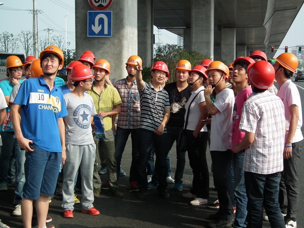 下午15:00,在項目部會議室,該項目總工利用PPT圖文并茂的給學生們介紹了阜陽北路高架工程概況、施工工藝、工程質量控制。隨后,學生們來到施工現(xiàn)場,該項目總工將學校中學習到的理論知識與現(xiàn)場施工實際相結合,對阜陽北路高架橋梁的整個施工工藝流程作了深入淺出的講解。